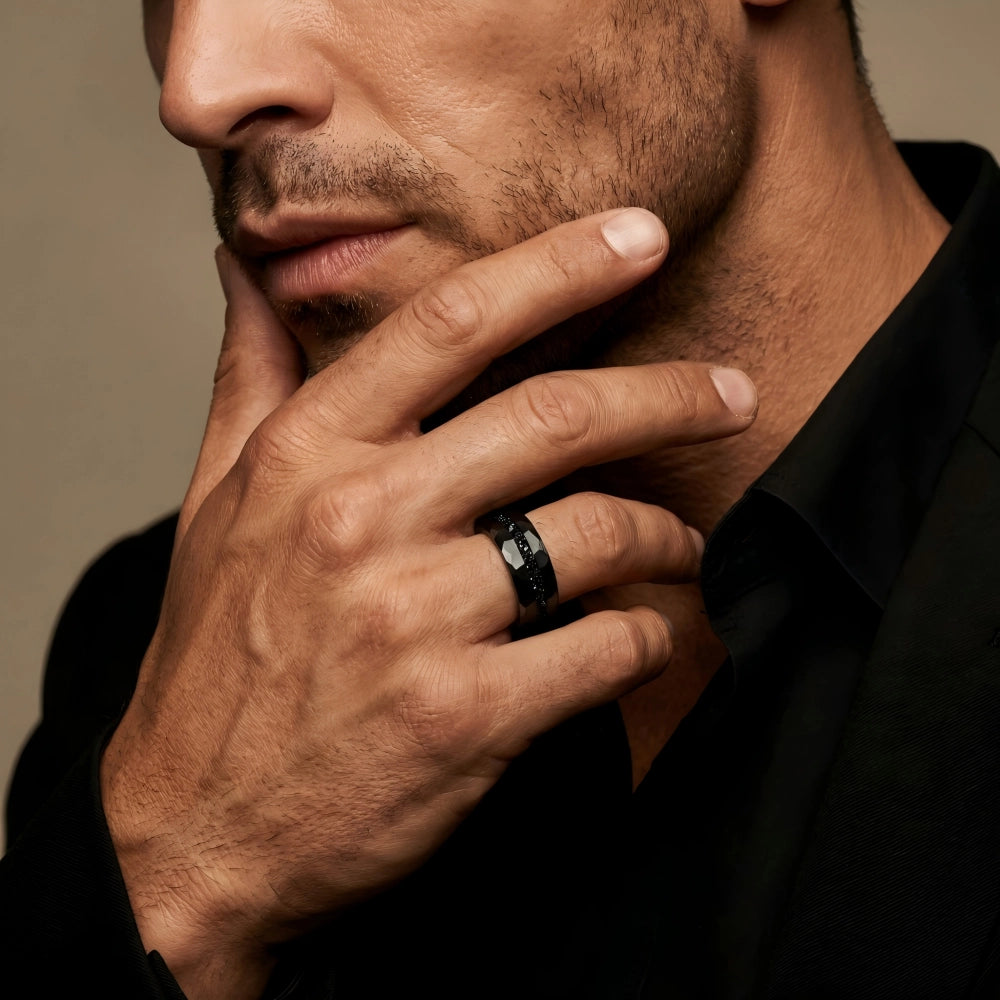 The Midnight Rift symbolizes the clarity found within the obsidian void. By encapsulating ancient meteorite fragments—matter that has traversed the silence of space—within a hand-hammered black tungsten bastion, it reflects the resilience required to navigate the unknown. It serves as a structural anchor for those who command their own path through the shadows